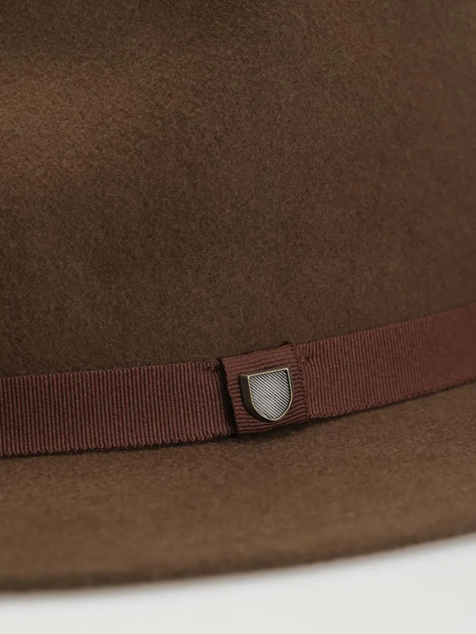 - Der Brixton Messer Fedora ist ein Filzhut mit einem Band und geprägtem Logo