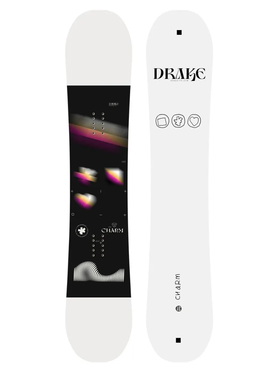 - Das Drake Charm –ist ein großartiges Board für alle Mädchen, die mit dem Snowboarden beginnen. Flaches Profil, das dir einen reibungslosen Übergang von Turn zu Turn ermöglicht.